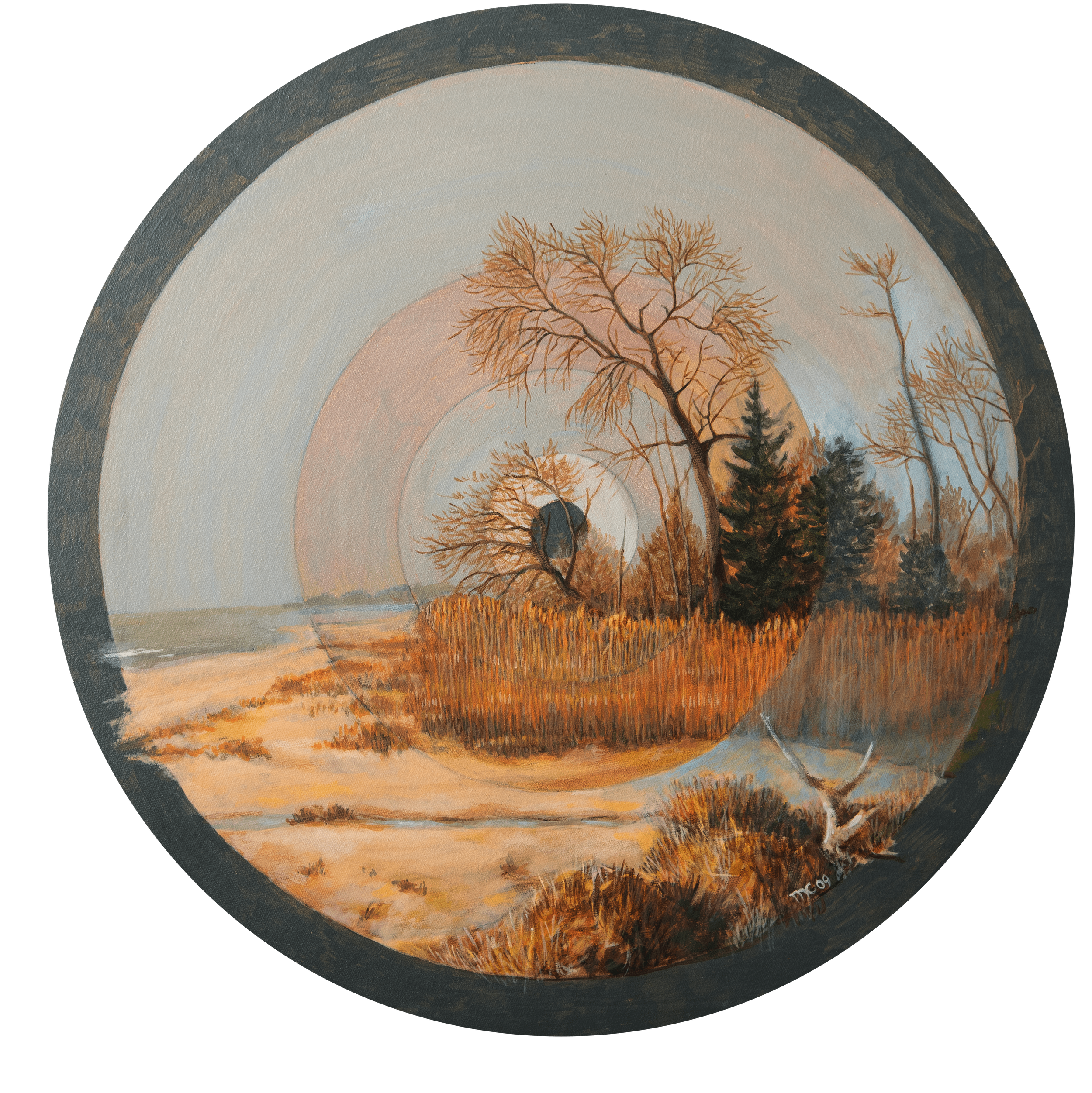 Fortunately I found some round canvasses I could use for my goal to paint landscapes as a target. At first I added even bullet holes to the circular target signs.